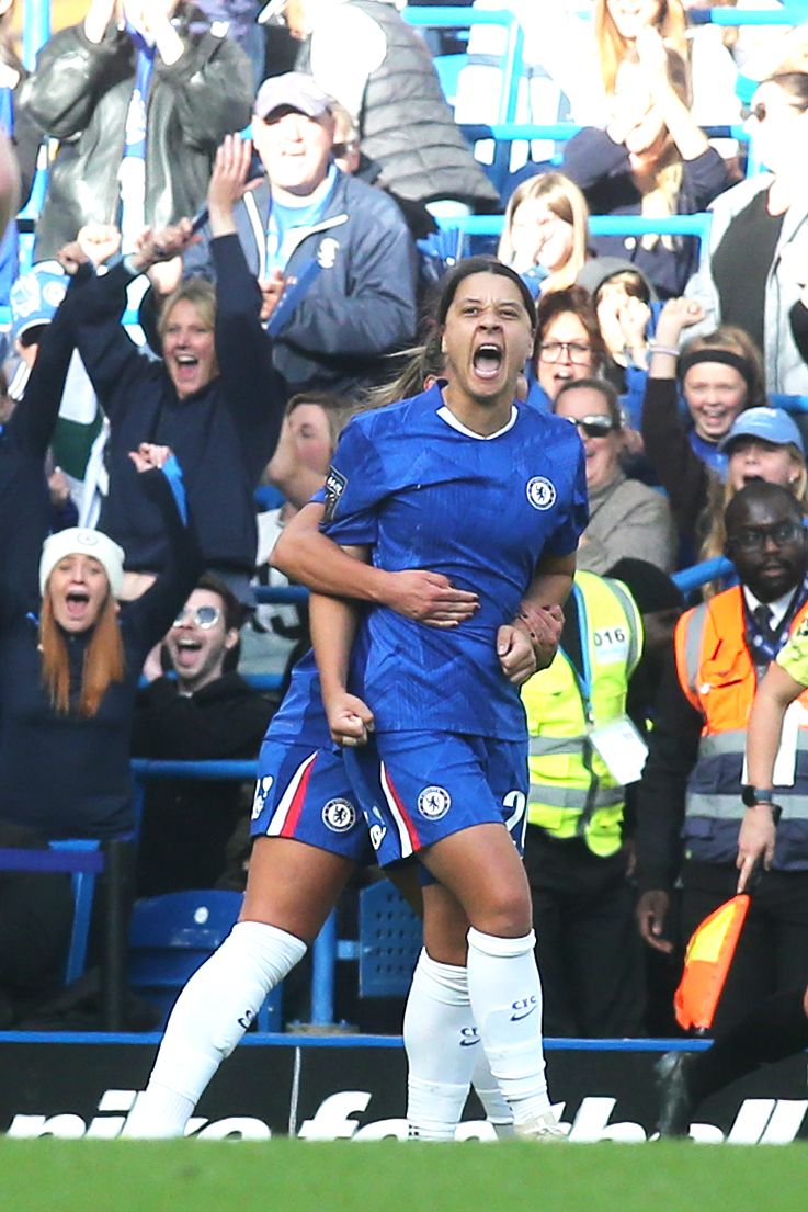 Sam Kerr joins the roaring crowd after her first Stamford Bridge goal since 2023 on 1 November 2025. Photographer: Shutterstock/Paul Dennis