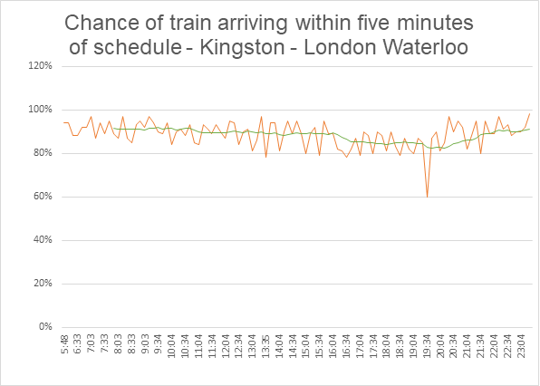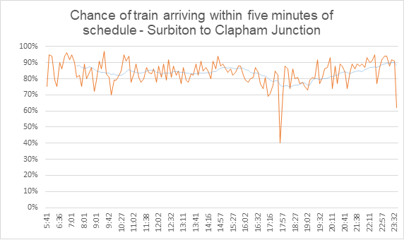 The graph above shows the likelihood of trains from Surbiton to Clapham arriving less than 5 minutes late throughout the day. Punctuality dips in the evening rush hour, with its lowest point around the 17:46 train.