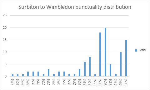 The graph above shows how likely it is for trains from Surbiton to Wimbledon to arrive on time on a regular basis. While a few trains are often late, most are reliable, with the average service arriving on time on 86 per cent of journeys.