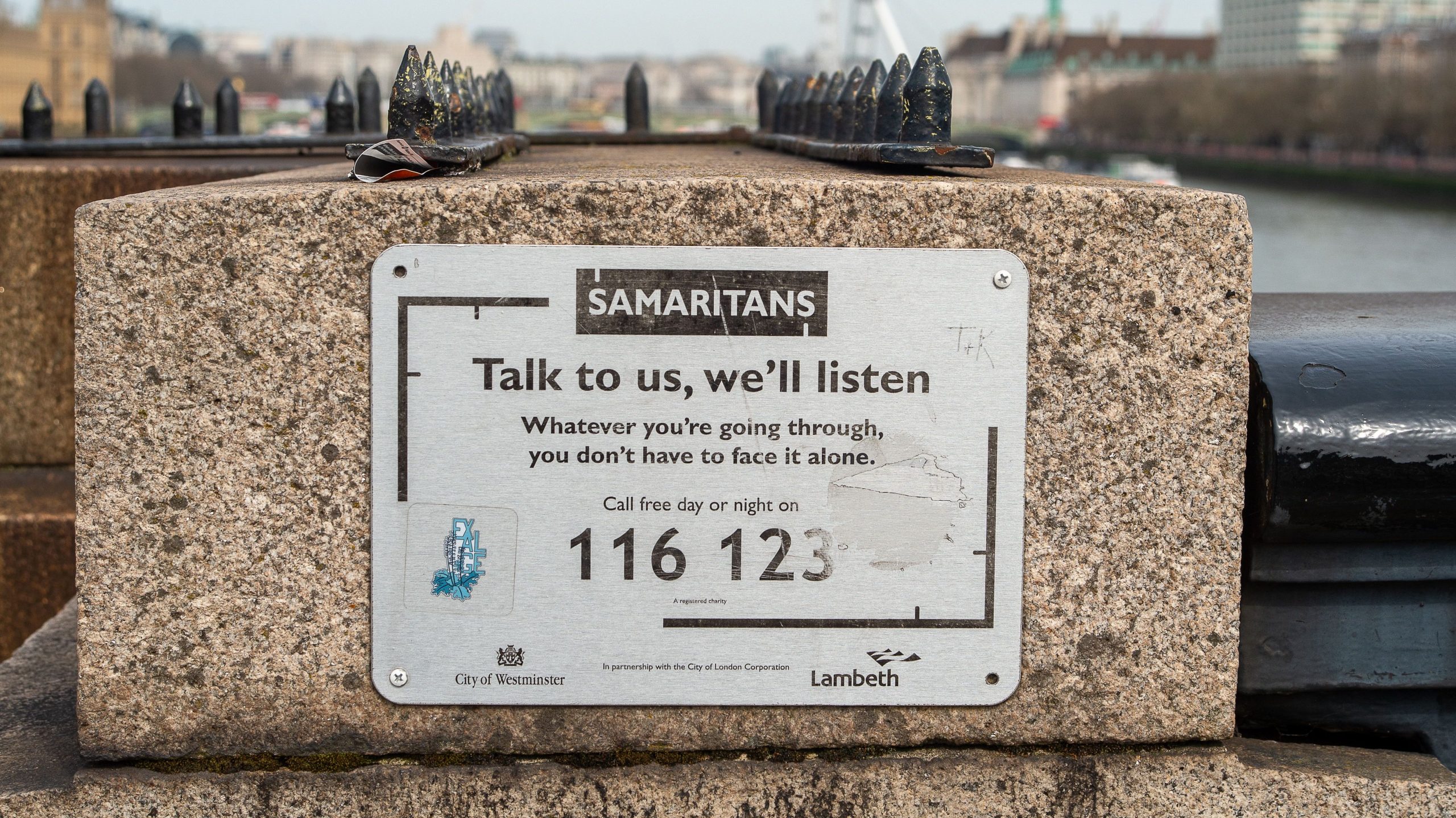 A Samaritan’s sign on a bridge across the River Thames in London. Credit: Maureen McLean / Shutterstock