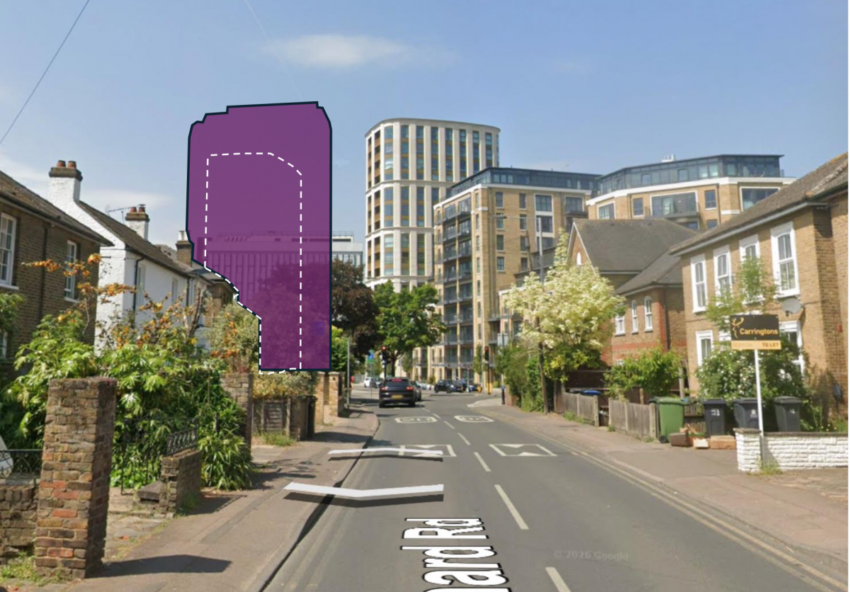 New Proposals Impact on Fairfield/Knights Park Conservation Area (View From Orchard Rd). Images are illustrative only and are based on approximate information about existing buildings and levels. Credit: Stephen Coates
